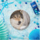Fête d'anniversaire animalière, animalière, sauvage, bûcheron. Photo d'une tête de loup. Un loup à l'air amical avec un sourire sur le visage. C'est l'hiver avec un arrière - plan blanc enneigé. Une assiette pour la fête du 13e anniversaire d'un garçon ado. Avec le texte : Joyeux anniversaire (x2) Modèle pour le nom de l'enfant, lettres noires. Texte courbe.