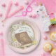 This plate has a Bible surrounded by a wreath of pink flowers in a wreath with a pink striped background with text that says "Women's Bible Study"