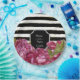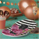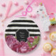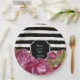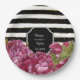 De jolies assiettes en papier personnalisées pour mariage floral présentent des pivoines roses aquarelles sur un fond moderne à rayures noires et blanches accentuées d'or. Ajoutez les noms des mariés et la date du mariage. Articles assortis disponibles dans ma boutique.