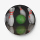 Assiettes en papier présentant une photo de quilles de bowling et une boule de bowling.