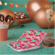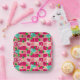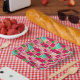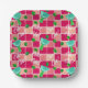 Assiettes en papier Martini et Olive à carreaux rose rétro. Ce design ludique présente une esthétique peinte à la main avec un fond à carreaux rose vif, rouge et blush. Dispersés sur le motif, des coupes à martini vert menthe illustrées et des olives vertes salées, accompagnées du toast italien festif "Cin ! Cin !" (Tchin !) dans une police de caractères cursive blanche.