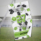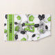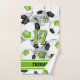 Cette serviette à main esprit d'équipe pour un joueur de football comprend le nom de l'athlète et le numéro du maillot, ainsi que le nom de l'équipe et de la mascotte qui surplombe l'image arrière - plan d'un groupe de balles de football vert, noir et blanc disposées aléatoirement sur un arrière - plan blanc. Les boules de football sont ombragées de façon sélective, ce qui leur donne une apparence 3D. Le nom de l'athlète peut être personnalisé sur des rayures horizontales vertes au bord inférieur de la serviette - par katz_d_zynes