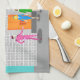 Vous êtes invité à l'événement social de l'année avec cette Atomique Palm Springs Stewardess Party conception de serviettes de cuisine. Joignez-vous à ces trois hôtesses de l'air vintages qui rivalisent avec les compagnies aériennes pour accéder à leur kitschy 1960's breezy block hotel. L'un des clochards fabuleusement accrochés dans un uniforme rose chaud rétro tient la porte orange tandis que l'autre lutte avec les bagages des femmes. Des palmiers turquoises s'élancent dans l'arrière - plan d'un ciel turquoise improbable alors qu'un jetliner survole. Ce design vous fera dire : "Sur votre marque, jet set, allez !"