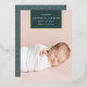 Le faire-part de naissance moderne et chic est doté d'une seule photo verticale/portrait à fond saigné avec un élément de bannière rectangulaire en haut, portant le nom du bébé, la date de naissance et les statistiques de naissance, et paré de feuille d'or. Ajoutez un message personnel à l'arrière, ainsi qu'une photo supplémentaire.