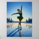 Une élégante peinture à l'huile Art Déco d'une patinoire en costume vert émeraude, sa forme géométrique épurée illuminée par le clair doré de l'aube, tandis qu'elle glisse à travers un lac poli et gelé.