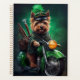 Un ami en fureur derrière les guidons d'une moto verte brillante, portant une tenue verte de la Saint Patrick qui fait tourner la tête. Le chien est habillé d'un ensemble festif, avec une cravate arc-en-ciel verte et un chapeau haut assorti qui se trouve doucement au-dessus de la tête. Le costume présente des motifs complexes de shamrocks et de leprechauns, ce qui indique clairement que ce chien est prêt à célébrer la Saint Patrick avec style.