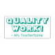 Ce design inspiré de timbres en caoutchouc comprend le message "QUALITY WORK!" et le nom d'un tuteur personnalisé. Il pourrait être utilisé par un enseignant, un éducateur, un instructeur ou un tuteur pour marquer les affectations, pour indiquer que l'étudiant a fait un excellent travail.