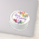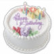 Autocollant vinyle taillé sur mesure avec l'image d'un gâteau d'anniversaire décoré de gel blanc, rosettes roses, jaunes et violettes et cinq bougies éclairées. Voir sac de faveur, étiquette de faveur, étiquette et papier d'emballage correspondant. Voir l'ensemble de la collection Sticker d'anniversaire dans les INVITATIONS | Section Stickers & Étiquettes.