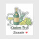 Composition de vin blanc. Bouteille, verre, tire-bouchon et raisins. Texte personnalisé.