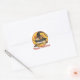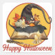 Autocollant carré sur le thème d'Halloween avec une illustration d'un chapeau de sorcière décoré sur un livre de sorts avec des bougies fondues et une baguette, le texte personnalisable "Joyeux Halloween" peut être laissé tel quel ou modifié avec une touche personnelle.