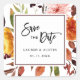 Ce faire-part de mariage est orné de fleurs d'aquarelle jaune, rose-rousse, orange, et de feuilles verts, bordeaux et marron avec cadre carré.