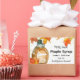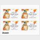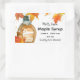 Un autocollant pour les bouteilles et/ou les pots pour annoncer la vente de sirop d'érable décoré d'une bouteille de sirop de verre et bordé de feuilles d'érable colorés et accentué de taches d'aquarelle sur un arrière - plan blanc avec texte noir que vous pouvez modifier pour répondre à vos besoins.