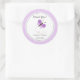 Autocollant rond pour la fête d'anniversaire avec design papillon violet et arrière - plan polkadot violet clair.