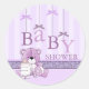Ce Sticker baby shower moderne personnalisable comporte des arcs violets. Customisez-le en ajoutant vos détails dans la police de votre choix !