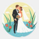 Comprend 20 petits autocollants sur une feuille. Autocollant romantique représentant une mariée et un marié s'embrassant avec des fleurs et un fond idyllique.