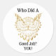 La tête et le visage impressionnants d'une chouette en or, est présenté sur cet autocollant rond classique. Avec un message, "Qui a fait un bon travail ? VOUS", fait un grand autocollant pour les enseignants à donner à leurs élèves et même aux membres de la famille pour les encourager à terminer le travail, les projets et plus autour de la maison!