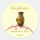Chouette dorée sur un autocollant de diplômé. La chouette dorée est debout sur une branche d'arbre en fleurs. Le texte est prêt à être personnalisé.