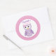 Un petit hibou mauve doux avec une fleur rose. Cet autocollant rond mignon est customisé avec vos propres 2 lignes de texte.