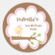 Cet autocollant rond de fête d'anniversaire pour filles a une jolie bordure de pétoncle rose et marron avec un coq jaune et rose debout sur une branche. Vous pouvez facilement customiser votre nom et vos informations de fête. Cocoa Studio com