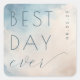 Cet autocollant de mariage présente un fond doux à l'aquarelle dans des tons bleu clair et beige, créant un effet éthéré rappelant le ciel. Le design affiche en bonne place la phrase "BEST DAY ever" avec une typographie majuscule grasse pour "BEST DAY" et une écriture cursive élégante pour "ever", ce qui donne une ambiance festive. Le style minimaliste met l'accent sur des lignes épurées et un mélange doux, ce qui le rend parfait pour marquer des occasions spéciales avec une touche de sophistication et de joie.
