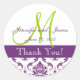 Carré, Monogramme vert, Étiquettes de Merci violet et blanc Mariage damassé. Mariage damassé Privilégie Les Stickers Merci. Présentation par Elke Clarke. Carte graphique sous licence. Vous avez besoin d'aide pour coordonner les articles "jour de" mariage pour votre mariage ? Veuillez contacter luxuryweddinginvitations@gmail.com