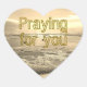 Autocollant en forme de cœur avec le texte « priant pour vous » sur un fond océanique. Couleurs de lever de soleil doré avec texte imprimé ouvert sur le devant en style grunge.