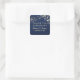 Élégant autocollant de remerciement de mariage carré avec des lumières de chaîne chaudes, un fond en bois bleu marine rustique et des accents floraux dorés délicats. Personnalisé avec les noms des couples et la date du mariage, il est parfait pour sceller les enveloppes, les faveurs et les cadeaux de remerciement de votre célébration.