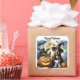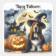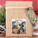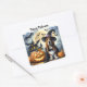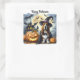 Une image mignonne d'un chien habillé en sorcière, avec des citrouilles et des chauves-souris, est présentée sur cet autocollant carré d'Halloween. Avec le message "Joyeux Halloween", cela fait un excellent autocollant à utiliser pour ces envois spéciaux, la décoration, le scrapbooking et plus encore !
