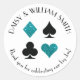 Les paillettes sarcelle faux et les enseignes de cartes noires sont encerclés par du texte personnalisable faisant de ces autocollants ronds parfaits pour toutes sortes de projets et occasions. Utilisez-les pour étiqueter les faveurs pour les invités de mariage, pour fermer les enveloppes et plus encore.