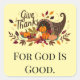 Une jolie image d'une corne d'abondance remplie de nourriture, est présentée sur cet autocollant carré de jour de Thanksgiving. Avec le message, "Rendez grâce car Dieu est bon", cela fait de cet autocollant un excellent élément à utiliser pour ces envois spéciaux, la décoration, le scrapbooking et plus encore !