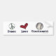 En 2010, il est tout au sujet de paix et d'amour à Cincinnati. Célébrez Cincinnati avec un adhésif pour pare-chocs frais de Cincinnati d'amour de paix ! Caractéristiques de conception un signe de paix, coeur et (ou cours) un base-ball. Idée de cadeau d'amusement !