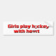 Quel grand adhésif pour pare-chocs pour les parents d'un joueur de hockey féminin ! Le texte est en rouge, et va voir 3D aux lettres, il y a également un coeur dans le mot lui-même, plus le symbole femelle dans le mot "hockey". Il lit, "hockey de jeu de filles avec le coeur"…