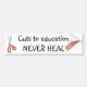 L'adhésif pour pare-chocs blanc qui lit des coupes à l'éducation NE GUÉRISSENT JAMAIS. Comporte l'image d'un bandage bandaid et des ciseaux manipulés oranges.