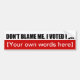 Ne me blâme pas ! J'ai voté pour [vos propres mots ici] Note : Vous pouvez changer la couleur arrière - plan de la zone personnalisable de rouge à n'importe quelle couleur que vous souhaitez. Il suffit de cliquer sur le bouton "Customiser!" ci-dessus, puis de cliquer sur la petite flèche en regard de "Modifier", de sélectionner "Arrière - plan" dans la liste déroulante, et de choisir la couleur de votre choix dans la grille de couleurs. Vous pouvez également modifier le type de police, la taille et/ou la couleur de votre texte en cliquant sur la zone de texte [Vos propres mots ici] sous "Customisez-le!".