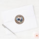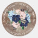 Autocollant d'étiquette d'adresse rond en bois rustique unique avec un beau bouquet de fleurs bleues marine et roses.