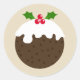Un autocollant de Noël simple avec l'illustration d'un pudding traditionnel de Noël avec glace blanche, feuilles saints et baies. L'arrière - plan est beige mais on peut le changer à tout ce qu'on veut. Ce serait parfait pour sceller les enveloppes sur vos cartes de Noël, pour faire des étiquettes cadeaux maison ou pour décorer des cadeaux.
