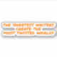 Ce n'est un secret pour personne que les gens les plus doux ont certaines des pensées les plus sombres. Cela s'étend aux écrivains sans exception. Plus un écrivain est doux, plus il est probable qu'il y ait des scènes les plus sombres dans son répertoire. Si vous connaissez un doux écrivain qui crée des mondes tordus, cet autocollant est le cadeau parfait. Ou, si vous êtes cet écrivain, peut-être devriez-vous avertir vos lecteurs. De toute façon, profitez de cet autocollant dans toute sa gloire, et avertissez vos futurs lecteurs de ce qu'ils sont dans.