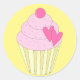 Un succulent cupcake avec glaçage à la fraise et des arcs-en-ciel sur le dessus. Décoré de coeurs d'amour du sucre et d'une boule de bonbons. Arrière - plan jaune.