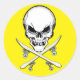 Autocollant rond avec crâne et os croisés - avec les os convertis en skateboards - pour un tour iconique unique, contre un arrière - plan jaune vif. Recueillez-les toutes.