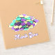 Autocollant vinyle taillé sur mesure avec une image de pièces en plastique métallique mardi Gras violet, vert et or et "Mardi Gras" en écriture violette française. Voir toute la collection Mardi Gras Sticker dans les INVITATIONS | Section Stickers & Étiquettes.