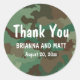 Le motif camouflage vert présente un motif aléatoire vert olive, marron, vert clair et gris foncé. Le Merci est écrit dans une police blanche en gras. Le nom du marié et du marié et la date du mariage sont en dessous.