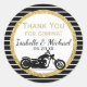 Élégant autocollant mariage de moto qui présente la silhouette noire d'une moto dans un cadre de parties scintillant or. Des rayures noires et blanches complètent le design élégant. Facile à customiser. Sera très bien sur les faveurs de mariage, les boîtes à gâteaux mariages, et des notes de remerciement.