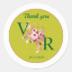 Élégant autocollant de remerciement de mariage avec l'expression "Merci", les initiales de la mariée et du marié avec un élément floral entre, et la date du mariage. Parfait pour sceller des boîtes-cadeaux, des faveurs de fête ou des cartes de remerciements. Ce design romantique et élégant apporte une touche personnalisée à votre journée spéciale. Entièrement personnalisable pour correspondre à votre thème mariage.