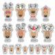 Visages de tous les rennes de l'équipe de Père Noël avec des étiquettes de nom.