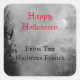 Un autocollant Bonne Halloween personnalisé en lettres noires gothiques et rustiques rouges sur fond de ciel d'Halloween avec des arbres brumeux, des corbeaux gothiques et une pleine lune nuageuse en noir, blanc et gris.