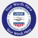 Cet autocollant personnalisé est décoré avec le bouclier USAID de l'Agence des Etats-Unis pour le Développement International qui peut être customisé avec un choix de mots ci-dessus et ci-dessous qui vous permet de le personnaliser avec le nom d'une personne, d'un lieu, d'un poste, etc.