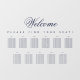 Un simple tableau de sièges transparent avec 11 tables, recommandé pour un mariage bleu marine, mais utilisable en d'autres occasions aussi. Il s'agit d'un cling de fenêtre, à mettre sur une fenêtre ou une autre surface transparente en verre ou acrylique. Tout le texte est bleu marine. Le mot Welcome est écrit dans un élégant script calligraphique, le reste en casquette. Les tables sont sur 2 rangées. Au-dessus d'eux et sous le mot Bienvenue, il y a le message "S'il vous plaît trouvez votre siège!".