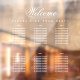 Un simple tableau de sièges transparent avec du texte blanc sur un arrière - plan transparent, avec 6 tables sur 2 rangées et 3 colonnes, recommandé pour un mariage, mais utilisable en d'autres occasions aussi. Il s'agit d'un cling de fenêtre, à mettre sur une fenêtre ou une autre surface transparente en verre ou acrylique. Tout le texte est blanc. Le mot Welcome est écrit dans un élégant script calligraphique, le reste en casquette. Au-dessus d'eux et sous le mot Bienvenue, il y a le message "S'il vous plaît trouvez votre siège!".