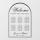 Un simple tableau de sièges mariage transparent à l'intérieur d'une arche moderne. Le texte et le cadre sont noirs. Le Welcome et les noms sont écrits dans une calligraphie élégante.