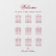 Un simple tableau de sièges transparent avec 9 tables, recommandé pour un mariage bordeaux, mais utilisable aussi en d'autres occasions. Il s'agit d'un cling de fenêtre, à mettre sur une fenêtre ou une autre surface transparente en verre ou acrylique. Tout le texte est rouge bordeaux. Le mot Welcome est écrit dans un élégant script calligraphique, le reste en casquette. Les 9 tables sont réparties sur 3 rangées. Au-dessus d'eux et sous le mot Bienvenue, il y a le message "S'il vous plaît trouvez votre siège!". Dans la partie inférieure, sous les tables, il y a un petit coeur et les noms de la mariée et du marié, écrits dans la même calligraphie.
